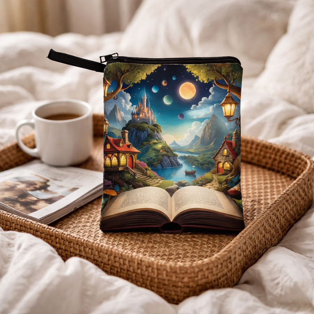 Um mundo fantástico com castelo, lago, montanhas e planetas — tudo a nascer de um livro aberto. Um visual que desperta imaginação e emoção.