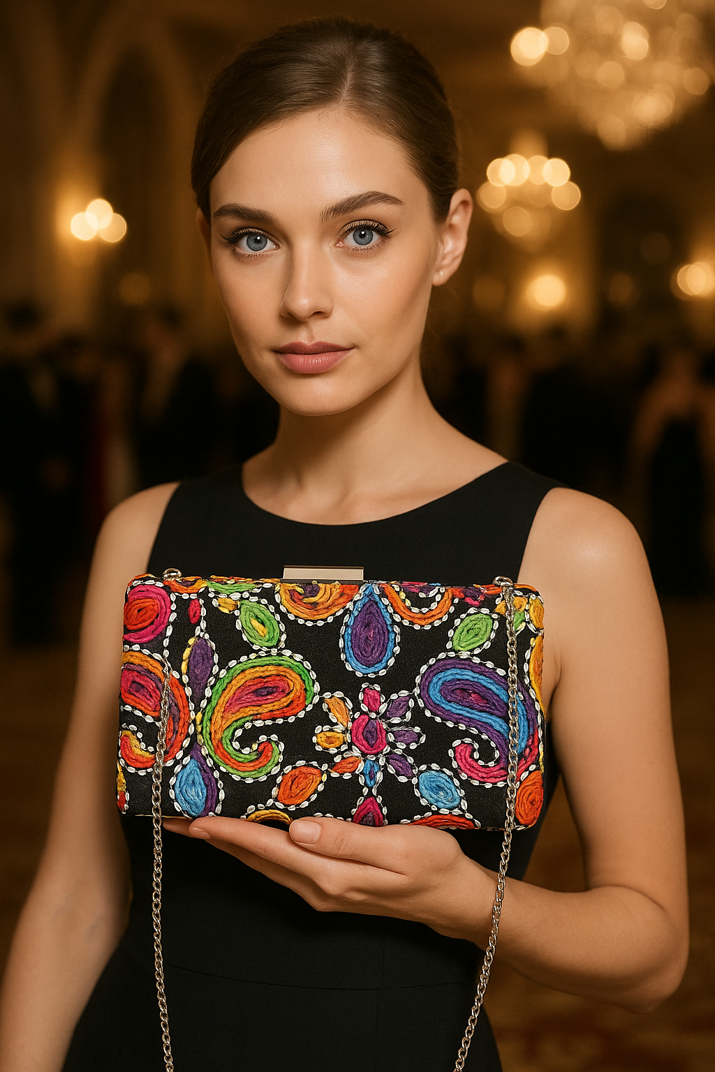 Clutch bordada colorida — elegância artesanal para festas e cerimónias. Fecho rígido e corrente removível. Dimensões: 22 x 12 x 5 (CxAxL)