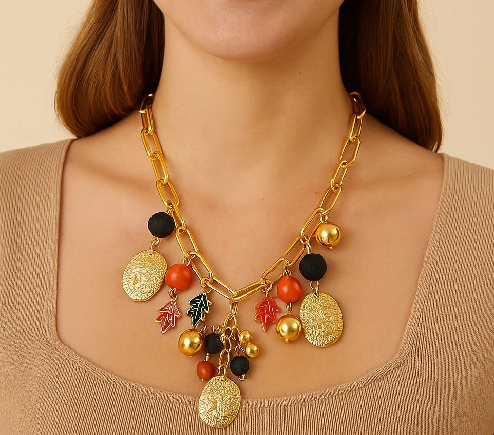 Charms de sol, pássaro, coração, pimento e formas coloridas.