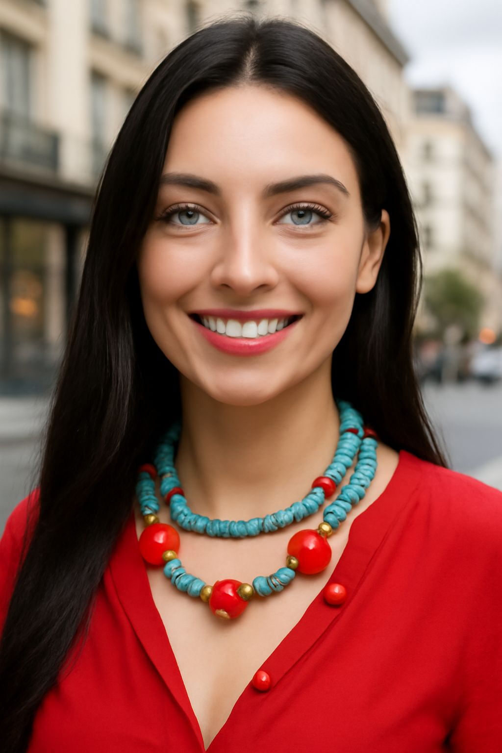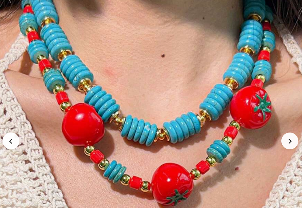 Colar boho multicamada com contas turquesa e detalhes vermelhos. Toque artesanal e vibrante.50cm de perímetro
