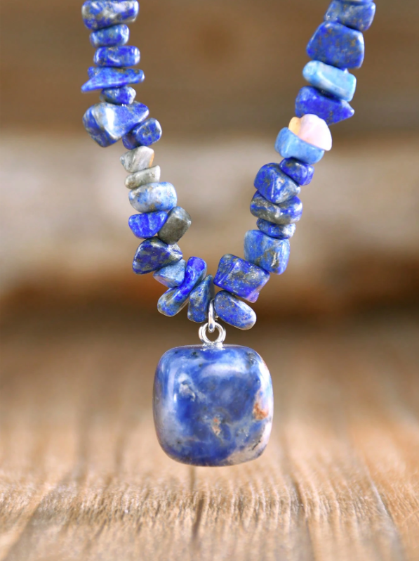 Colar com pedras naturais de lápis‑lazúli (~45 cm) e pendente em pedra polida. O lápis‑lazúli é associado à clareza mental, comunicação autêntica e proteção espiritual. Ideal para elevar looks casuais e formais com um toque boho sofisticado.