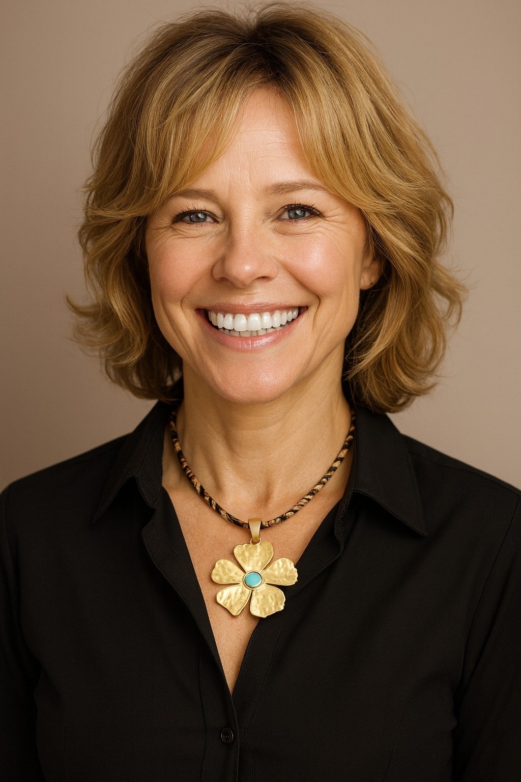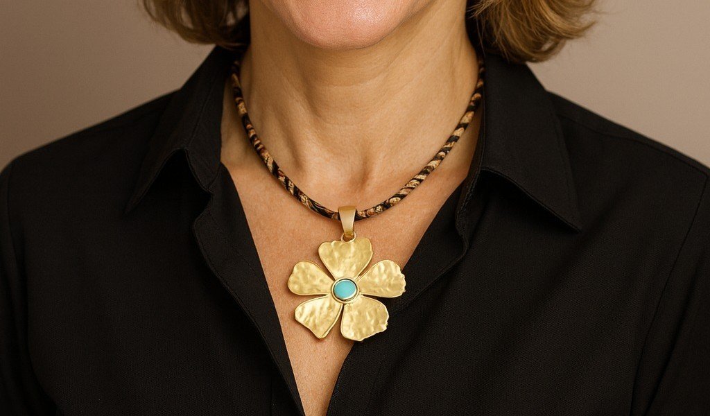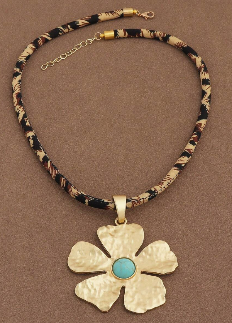 Colar com pendente flor martelada dourada e centro turquesa e cordão leopardo
