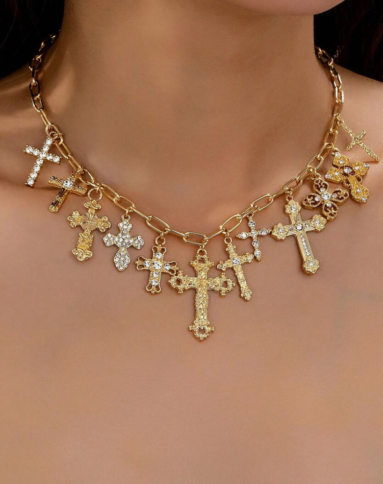 Colar curto com várias cruzes douradas e cristais.