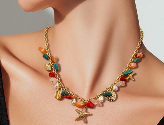 Este colar combina conchas, estrela do mar e detalhes coloridos que lembram dias de praia e pôr do sol à beira-mar. Corrente dourada elegante