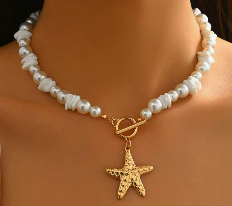 Com pérolas brancas delicadas e fecho dourado frontal, o destaque vai para o pendente em forma de estrela do mar, que acrescenta um toque sofisticado e fresco à peça.
