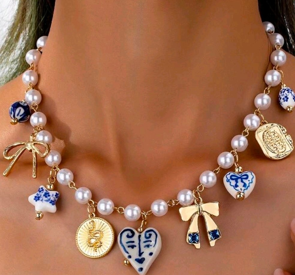 Com pérolas delicadas e medalhas douradas, este modelo destaca-se pelos pendentes em azul e branco que lembram o charme dos azulejos portugueses. Uma peça feminina, sofisticada e cheia de personalidade.